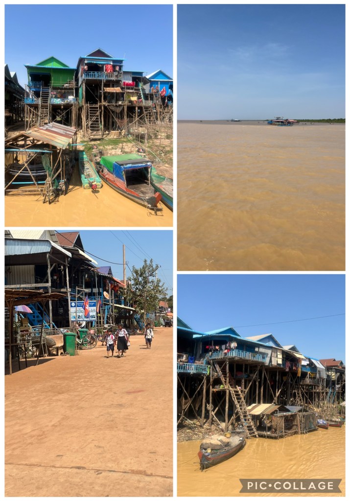 Friday was our final day in Cambodia, and the main activity was a visit to a fishing village at the mouth of Ton Le Sap – a massive and very important lake near Siem Riep. Kampong Phluk village’s houses are built on stilts, as a way of working with the level changes of the river beside which they stand. They were mind-blowing! We took a boat trip, from which we disembarked to wander along the main road of the village to look at the Pagoda, school, library and shops, before heading out on to the lake itself. Immense. Our guide told us that as well as being important to the Cambodian fish trade (175 different species live in the lake), the area is also home to 225 different bird types, 43 mammal species, and 46 reptile. It’s over 53km wide!