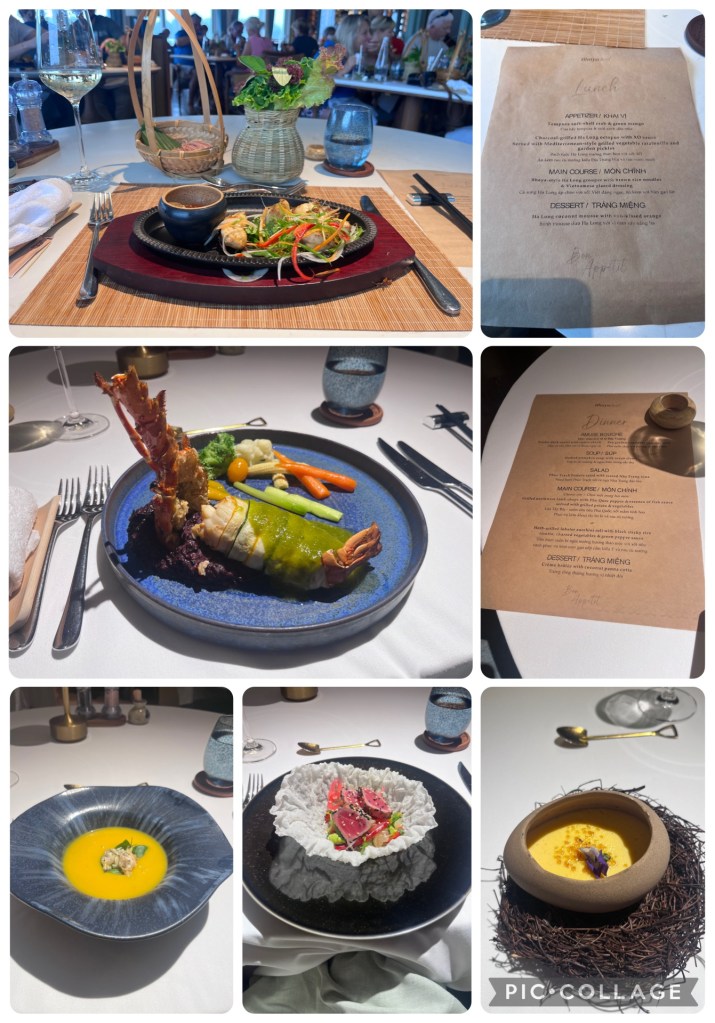 As part of my package, I had full board, several activities and a complimentary foot massage. I also had numerous ‘gifts’ – a silk shawl, a fan, a Panama hat (which I left behind lol), a dried kumquat for bedtime, a slug of rice wine after dinner, and a bag of cookies for the journey back to Hanoi!! I did a sleep meditation under the stars, and two boat trips – one around one of the bays we were moored in, and one to visit a floating village. The food… was just amazing. We had a 3-course lunch and 5-course dinner. I thought I was going to burst.